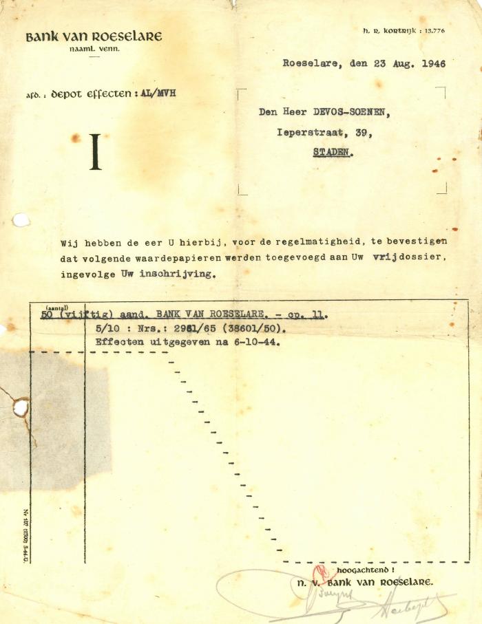 een schrijven ivm waardepapieren van dhr Devos Staden